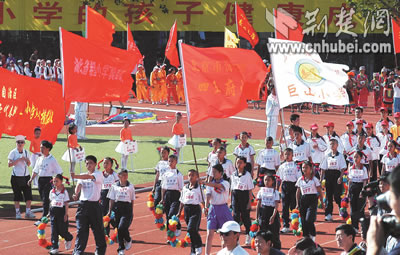 全國首屆希望小學運動會昨日在北京開幕,來自大別山下英山縣石頭嘴鎮(zhèn)希望小學的20名學生代表,向首都觀眾展現了湖北少年勤奮好學,勇于拼搏的形象。據了解,中國青少年發(fā)展基金會發(fā)起實施希望工程15年來,已資助250多萬名農村貧困學子,援建希望小學萬余所。湖北日報記者 王威 攝