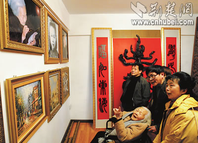 “這是特意為您準(zhǔn)備的生日禮物!”年過(guò)六旬的盧永瀚攙扶著92歲的母親,在根雕、油畫(huà)面前仔細(xì)講解!斑@個(gè)根雕是壽字!”孫女插話說(shuō):“就是祝您長(zhǎng)壽,活過(guò)100歲!”慧老太太邊看邊比劃著,樂(lè)得合不攏嘴,用濃重的江浙口音說(shuō):“好、好!”