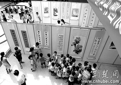 7月28日,武漢市江漢區(qū)常青街在市博物館內(nèi)舉辦“紅色書畫展”。該街道30家文明單位的職工,親手繪出一幅幅丹青作品,向抗戰(zhàn)勝利60周年獻(xiàn)禮。