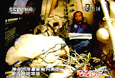 中午12時35分,神舟六號飛船正飛越我國上空,在雷鳴般的鞭炮聲中,慶祝航天英雄聶海勝41歲生日的儀式正式開始,中央電視臺同步直播。