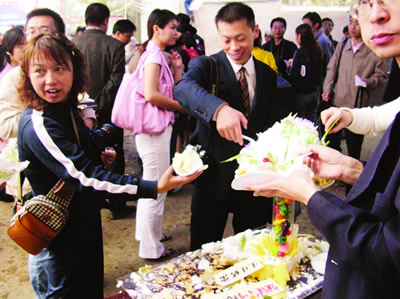 工作人員忙碌地張羅著。記者還發(fā)現(xiàn),在聶家新房前,新壘起了一個大磚灶,上面架一口大鐵鍋,鍋內(nèi)熱氣騰騰。經(jīng)打聽得知,因擔(dān)心前來道賀的親友眾多,工作人員特意向當(dāng)?shù)貜N師借來一口大鍋,用于煮長壽面。因鍋實在是太大,聶家沒有相應(yīng)的灶能架住,于是人們在前日傍晚時分,臨時壘了這座灶臺。慶祝儀式結(jié)束后,記者上前打聽一共向這口大鍋里下了多少面條。兩名幫忙的鄉(xiāng)親說:“我們不停地在下面條,已經(jīng)記不清到底下了多少了!”他們還告訴記者,在當(dāng)?shù)兀昭缛绱寺≈,天南海北的人如此眾多,如此受到關(guān)注,在楊垱鎮(zhèn)甚至在整個襄樊市“都應(yīng)該是第一次”。