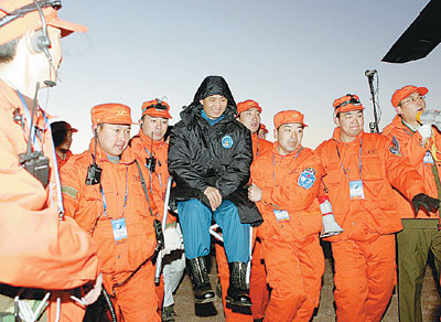 費(fèi)俊龍、聶海勝隔著舷窗,在向人們招手———返回艙內(nèi)柔和的燈光,映著他們的微笑。這一刻,距他們離開大地4天又19個多小時,他們的總行程為325萬余公里。