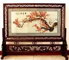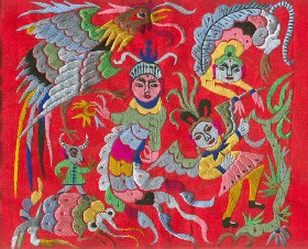 苗繡 刺繡,是苗族婦女盛裝不可或缺的飾物,主要有領(lǐng)花、肩花、襟花、背塊花、袖口花、裙鑲花、帽頂花、帽頂花等品種。苗族刺繡,整體上多為幾何構(gòu)圖,古樸多姿。其圖案因繡片條、塊的不同,分為幾何二方連續(xù)式和四方連續(xù)式構(gòu)圖。其圖案取材于生活中常見(jiàn)的草木、鳥(niǎo)獸、蟲(chóng)魚(yú)、器具等。圖案的整體布局一般以菱形為立體紋樣,常見(jiàn)的是大菱形中套小菱形,小菱形又分別由不同色彩的方、圓、三角點(diǎn)狀組成。條狀繡片,多用點(diǎn)、線或線面組合,一整二剖構(gòu)圖。繡片是按布的經(jīng)緯戳針,故曲線多折角。大塊繡片,如背塊花等,多用菱形四方連續(xù)構(gòu)圖,并在其中布以對(duì)稱的變形幾何點(diǎn)及其他折線。所有繡片,粗看五彩斑斕,細(xì)觀則不同色線組圖分明,交錯(cuò)重疊,既復(fù)雜多變又結(jié)構(gòu)嚴(yán)謹(jǐn)、條理清晰。繡法很多,有平繡、凸繡、辮繡、堆花、縐繡、纏繡、挑繡、抽花等。平繡是最曾遍的繡法。這種繡法是重于圖案布局的美觀勻稱,色調(diào)鮮明,有明顯的物象感。凸繡流行于凱里、臺(tái)江部分地區(qū),它是在底布上多鋪幾層紙花,使所繡圖案凸出,有立體感。辮繡只在雷公山巴拉河一帶流行,其方法是將若干根色線編成辮子,按設(shè)計(jì)圖案平鋪于底布上,用絲線釘牢即成。圖案色調(diào)大致是青年女子鮮艷,中年以上婦女稍渾暗。如凱里、黃平、施秉等地,姑娘及較年輕婦女的盛裝刺繡以青布作底,繡大紅,間有少量白黃綠之色,亮麗醒目;中年以上婦女盛裝刺繡,亦以青布作底,以紫藍(lán)為基調(diào),間以少許桔紅、綠、白等色,顯得深沉穩(wěn)重。 京繡 京繡又稱宮繡,明清時(shí)期開(kāi)始大為興盛,多用于宮廷裝飾、服飾,用料講究、技術(shù)精湛、格調(diào)風(fēng)雅,民間高檔的宮繡大都與皇宮有著千絲萬(wàn)縷的聯(lián)系。京繡屬手工刺繡,所以在今天機(jī)繡發(fā)達(dá)的時(shí)候,為區(qū)別于機(jī)繡又名“手繡”。京繡在解放后,逐漸形成了自己鮮明的藝術(shù)特點(diǎn)與風(fēng)格,其選料精當(dāng)貴重,針工巧妙得體,色彩絢麗豪華,格調(diào)高雅。其中最好為針工中的“平金打籽”繡。這種繡,是以真金捻線盤(pán)成圖案,或結(jié)籽于其上,十分精致,華貴。 發(fā)繡 發(fā)繡,又稱“墨繡”。是以人的頭發(fā)為材料,在綢緞、絲絹或滌綸布上精心繡制的特種藝術(shù)品。具有淡雅、不褪色、耐腐蝕、利于收藏等特點(diǎn)。彩色發(fā)繡是相對(duì)于單色發(fā)繡而言,它是指以不同人種的天然色澤發(fā)絲為材料,遵循色彩規(guī)律,在繃平整的布帛上施針度線,塑造形象的藝術(shù)。作品的質(zhì)感效果特別好, 畫(huà)面有微妙的色彩變化,層次較單色發(fā)繡豐富,技巧靈活多變,形象更加栩栩如生。 材料的特質(zhì)屬性賦予發(fā)繡藝術(shù)獨(dú)特的魅力,具有豐富的人文內(nèi)涵,如用自己的頭發(fā)繡一幅寫(xiě)真“二我”,具有生命的直接紀(jì)念意義。作品集繪畫(huà)與刺繡為一體,具有一定的美學(xué)價(jià)值和經(jīng)濟(jì)價(jià)值,又能經(jīng)久保存,千年不變,可謂收藏極品。 甌繡 由于溫州地處甌江之濱,故得名“甌繡”。400多年以前,浙江溫州地區(qū)已運(yùn)用刺繡美化服飾, 繡品技藝也達(dá)到相當(dāng)水平。據(jù)說(shuō)甌繡最早產(chǎn)生于民間婦女之手,那時(shí)的刺繡品種有衣服、小兒帽 圈、圍涎、錦肚、婦女鞋面、枕頭、荷包等。題材只有花鳥(niǎo)魚(yú)蟲(chóng)之類。甌繡真正成為供欣賞的藝 術(shù)品只有60多年歷史。1922年前后,溫州刺繡藝人林森友在上海一家刺繡莊發(fā)現(xiàn)了湘繡畫(huà)片, 回來(lái)后開(kāi)辦了“美艷”刺繡作坊,仿照湘繡畫(huà)片的技法,改進(jìn)甌繡生產(chǎn)。從此,溫州出現(xiàn)了甌繡畫(huà)片。