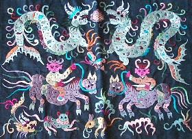 魯繡 魯繡——山東地區(qū)的代表性刺繡,是歷史文獻(xiàn)中記載最早的一個(gè)繡種,屬中國(guó)“八大名繡”之一。 “齊紈”、“魯縞”早在春秋戰(zhàn)國(guó)時(shí)期已是全國(guó)聞名的產(chǎn)品。當(dāng)時(shí)齊國(guó)有“冠帶衣履天下”的盛譽(yù)。據(jù)《論衡》記載:“齊郡刺繡,恒女無(wú)不能者,目是而手狎也”。 從唐代后期,我國(guó)北方連年戰(zhàn)亂,桑地及織繡生產(chǎn)受到嚴(yán)重破壞,若干織繡工人遷徙南方,北方刺繡長(zhǎng)期衰落。直至明代后期,魯繡又聞名于世,達(dá)到高度水平。 現(xiàn)在臨淄考古組存有東周時(shí)期的刺繡殘片,鄒縣文物保管所存有元代的魯繡珍品,故宮博物院存有較多的明代魯繡,如《百鳥(niǎo)朝鳳圖》、 《羅漢圖》,其構(gòu)圖嚴(yán)謹(jǐn),手法多樣,花紋粗獷雄健,質(zhì)地堅(jiān)實(shí),色彩對(duì)比強(qiáng)烈,形象生動(dòng),是魯繡杰出的代表作。 魯繡主要特點(diǎn)是:構(gòu)圖簡(jiǎn)練樸實(shí)、色彩明亮對(duì)比強(qiáng)烈,針?lè)ù旨?xì)相間,極富裝飾性和立體感,既華麗而又素雅。其代表產(chǎn)品主要有花鳥(niǎo)、書(shū)法、人物。 魯繡憑其工藝精湛、構(gòu)圖和色彩迷人受到了全世界人們的寵愛(ài)。早在兩千年前的漢朝,魯繡就通過(guò)絲綢之路傳到西亞,轉(zhuǎn)而傳向歐洲的羅馬帝國(guó)。目前,刺繡已出口到一百多個(gè)國(guó)家和地區(qū),成為中國(guó)刺繡文化與和平藝術(shù)的使者。 汴繡 汴繡,也稱宋繡,距今已有八百余年歷史,是我國(guó)名繡之一,素有"國(guó)寶"之稱。它以繡工精致,針?lè)?xì)密,圖案嚴(yán)謹(jǐn),格調(diào)高雅,色彩、秀麗而著稱,早在宋代就已馳名全國(guó)。據(jù)記載:北宋時(shí)期已有"文繡院"。當(dāng)時(shí)皇帝的龍袍、官員的朝服、烏紗帽、朝靴都為刺繡精品。據(jù)《東京夢(mèng)華錄》載,民間刺繡也極為興盛,到處"繡簾相拓"、"錦繡交輝"。宋代刺繡工藝已發(fā)展到相當(dāng)水平,據(jù)明代屠龍《畫(huà)箋》所載,"宋之閨繡畫(huà)……女紅之巧,十指春風(fēng),迥不可及'。北宋滅亡,汴繡遭動(dòng)一蹶不振。 為了繼承宋代閨繡這一傳統(tǒng)工藝,開(kāi)封汴繡廠于一九五四年成立。建廠后,新老藝人在繼承傳統(tǒng)工藝的基礎(chǔ)上,錄蹤探微,博采眾家之長(zhǎng),反復(fù)試驗(yàn),在傳統(tǒng)的以平針為主的技藝之上,又創(chuàng)新了散針、亂針、滾針、水紋蒙針等幾十種針?lè)。多種針?lè)ǖ慕惶媸褂茫粌H能把陰陽(yáng)遠(yuǎn)近一一表現(xiàn)出來(lái),而且表現(xiàn)內(nèi)容豐富,富有立體感。汴繡針?lè)乳L(zhǎng)于刺繡花鳥(niǎo)蟲(chóng)魚(yú)飛禽走獸,又善于創(chuàng)作氣勢(shì)磅礴的山水圖景,刻畫(huà)人物形象更是細(xì)致傳神。繡品既具有蘇雅潔活潑的風(fēng)格,又具有粵繡明快豪放的特點(diǎn)。1959年汴繡《清明上河圖》繡成,作為國(guó)慶十周年獻(xiàn)禮,陳列在人民大會(huì)堂,它以針代筆,以線代暈,使這幅宏偉浩繁的歷史風(fēng)俗畫(huà)卷逼真地展現(xiàn)在人們眼前。作品展覽時(shí),中外客人無(wú)不嘆服。 改革開(kāi)放以來(lái),汴繡工藝又得到進(jìn)一步的發(fā)展與創(chuàng)新,精品選出,如《清明上河圖》、《百駿圖》、《五牛圖》、《韓熙載夜宴圖》、《簪花仕女圖》等繡品均為國(guó)家收藏或被國(guó)外友人重金購(gòu)去。此外,汴繡除刺繡之外,還有單面繡、雙面繡、三異繡及大量機(jī)繡產(chǎn)品,品種繁多,題材廣泛。 漢繡 漢繡主要流行于荊沙、武漢、洪湖一帶。漢繡作品曾多次在京展出,還參加了巴黎、華沙等國(guó)際展覽,受到好評(píng)。 漢繡,以楚繡為基礎(chǔ),融匯南北諸家繡法之長(zhǎng),揉合出了富有鮮明地方特色的新繡法。它的用針有別于四大名繡……蘇繡、蜀繡、湘繡和廣繡,采用一套鋪、平、織、間、壓、纜、摻、盤(pán)、套、墊、扣的針?lè)ǎ浴捌浇饖A繡”為主要表現(xiàn)形式,分層破色、層次分明,對(duì)比強(qiáng)烈。追求充實(shí)豐滿、富麗堂皇的熱鬧氣氛,繡品可以枝上生花,花上生葉,葉上還可出枝,充分體現(xiàn)了“花無(wú)正果,熱鬧為先”的美學(xué)思想,呈現(xiàn)出渾厚、富麗的色彩。 從春秋中期到戰(zhàn)國(guó)時(shí),楚國(guó)的刺繡品已遠(yuǎn)銷(xiāo)到西伯利亞地區(qū),可見(jiàn)其刺繡業(yè)之發(fā)達(dá)。南方的楚國(guó)絲織業(yè)足以代表當(dāng)時(shí)我國(guó)絲織品工藝技術(shù)的最高水平。屈原的《楚辭·招魂》為我們描繪了一幅楚宮絲織品圖畫(huà),“翡翠珠被,爛齊光些。蒻阿拂壁,羅帳張些;纂組綺縞,結(jié)琦璜些!鋷鋷,飾高堂些”,“被文服纖,麗而不奇些。”這種需求對(duì)刺繡品的生產(chǎn)、發(fā)展的刺激是不難想見(jiàn)的。同時(shí),楚文化氛圍下民間戲曲的發(fā)達(dá)、巫風(fēng)巫月術(shù)的盛行又為刺繡走向民間提供了生長(zhǎng)的沃土。 漢繡的鼎盛期是清末民初。咸豐年間,漢口設(shè)有織繡局,集中各地繡工繡制官服和各種飾品。清末,在武昌的營(yíng)坊口、塘角、白沙州、積玉橋和漢口的黃陂街、大夾街一帶,開(kāi)有許多繡鋪,漢口還有一條繡花街。當(dāng)時(shí)的漢繡產(chǎn)品主要分三類:作為生活用品的有繡衣、繡枕、門(mén)簾、帳沿、繡鞋、頭巾、圍裙、荷包等,多用于閨閣陪嫁。