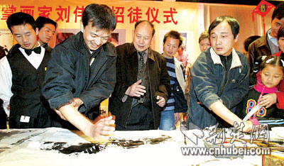 12點(diǎn),比拼結(jié)束,張俁俁、萬正濤、武大學(xué)生張艷平等10人順利地成為劉偉新的入室弟子。“他們年輕、書畫功底扎實(shí),看來我的掌畫將后繼有人!眲バ乱荒樞σ。