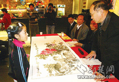 “劉老師,看看我的畫吧!”9歲的張俁俁是武昌中華路小學(xué)學(xué)生,她第一個(gè)交出自己的牡丹長(zhǎng)卷請(qǐng)老師“檢閱”。陪同前來的母親吳女士在一旁介紹:“俁俁看到報(bào)紙后就一直惦念這事。今天一早她就起床了,拉著我跟她外婆往這趕。”