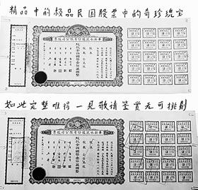 有關(guān)人士介紹,民國(guó)時(shí)期的老股票,采用了較美觀、實(shí)用的“三聯(lián)式”發(fā)行,由“存根、本票、息票”三部分組成。這兩張股票三聯(lián)俱全,如為真票,將具備較高的收藏價(jià)值。