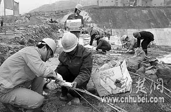 在泥濘的堰頂上,年輕的侯國榮正冒著霏霏細雨,指揮十幾名身著防爆服的工人,進行爆破網(wǎng)絡(luò)連接作業(yè)。作為爆破的現(xiàn)場負責(zé)人,侯國榮和他的伙伴們從春節(jié)前就奮戰(zhàn)在工地上,一天也沒有休息。