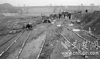 2月27日下午,雨霧中的爆破現(xiàn)場一片寂靜。6條長90米、直徑0.6米的吸水鋼管已停止向圍堰基坑內(nèi)充水。基坑內(nèi),一泓江水微波蕩漾。