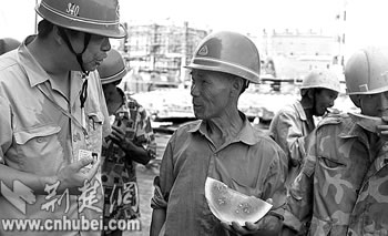 11日,武鋼修建公司工會(huì)為農(nóng)民工送去西瓜和汽水。由于該公司工會(huì)堅(jiān)持以人為本的管理思想,積極改善農(nóng)民工工作環(huán)境,為他們配備了空調(diào)、冰柜和防暑降溫的冰飲、藥品,并在高溫期間實(shí)行錯(cuò)時(shí)工作制等多項(xiàng)人性化管理辦法,大大地調(diào)動(dòng)了農(nóng)民工的積極性。