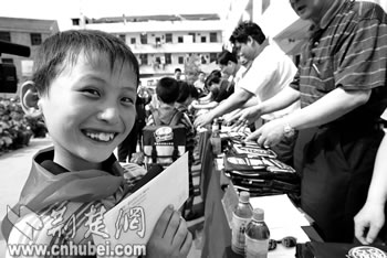 我省2005年春季“希望工程助學進城計劃———金龍魚農(nóng)民工子女助學金”本月起開始陸續(xù)發(fā)放,1000余名在漢打工的農(nóng)民工子女可獲得每學期300元的資助款。預計五年內(nèi),我省將有4000人次的農(nóng)民工子女獲此項資助。圖為武漢市東升學校二年級的李灣小朋友領(lǐng)到助學金后高興地笑了。