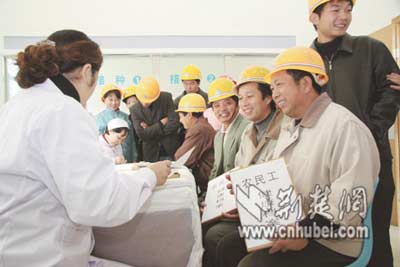 昨日和他一起接受免費體檢的,還有另外在百步亭從事建設(shè)的400多名農(nóng)民工。