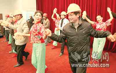 荊楚網(wǎng)(楚天都市報(bào))昨日,漢口百步亭花園居民自編自演了一臺文藝節(jié)目,奉獻(xiàn)給為該社區(qū)建設(shè)作出貢獻(xiàn)的農(nóng)民工們。演出中,市民熱情邀請農(nóng)民工朋友登臺跳舞。