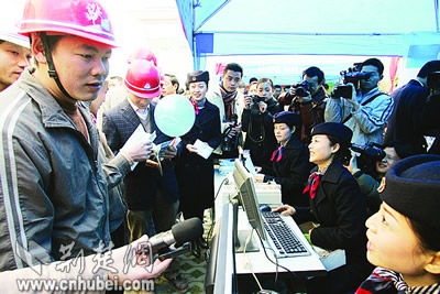 像譚梅一樣,昨天共有300多名農(nóng)民工涌到武漢市總工會大院,參加了在這里舉行的武漢市農(nóng)民工“平安返鄉(xiāng)”票務(wù)趕集會。在武漢市總工會組織下,漢口火車站、傅家坡長途汽車站、武漢港務(wù)集團客運站等7家客運單位,紛紛來到趕集會現(xiàn)場,為農(nóng)民工提供熱情的票務(wù)服務(wù)。