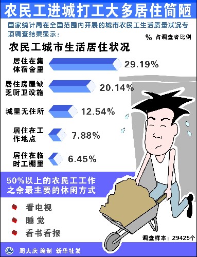 農(nóng)民工在城市打工,大多居住在簡(jiǎn)陋的宿舍里。據(jù)調(diào)查,有29.19%的農(nóng)民工居住在集體宿舍里,有20.14%的農(nóng)民工居住在缺乏廚衛(wèi)設(shè)施的房間里,有7.88%的農(nóng)民工居住在工作地點(diǎn),有6.45%的農(nóng)民居住在臨時(shí)搭建的工棚里,還有12.54%的農(nóng)民工在城里沒(méi)有住所,只能往返于城郊之間,或回農(nóng)村居住。