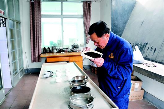 湖北省趙李橋茶廠有限責(zé)任公司檢驗(yàn)室內(nèi),59歲的甘多平將青褐色磚茶原料倒入評茶盤內(nèi),緩緩搖動(dòng)后,仔細(xì)端詳、細(xì)嗅香氣,“顆粒勻、香氣正,這批原料不錯(cuò)?!?/P>