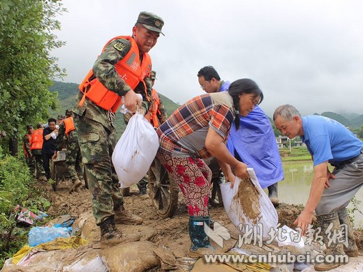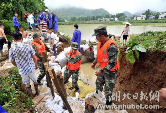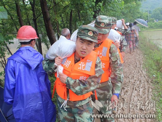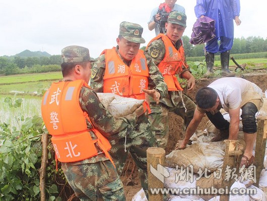 災(zāi)情就是命令,武警湖北總隊咸寧支隊立即啟動應(yīng)急機制,按預(yù)案迅速出動官兵20余名,攜帶救生繩、救生圈、編織袋、鐵鍬、洋鎬等工具第一時間奔赴現(xiàn)場,擔(dān)負裝填沙袋和筑堤任務(wù)。