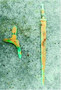 現(xiàn)場施工負責人杜正祥介紹,這里的村民文物保護意識強,這個安置點是7月28日開始施工,用挖掘機挖基腳,第二天,民工們用鏟清理基腳泥土時,挖出一硬物,刨出來一看,是一把生了銅銹的劍,還有一把彎彎的刀,大家認為這可能是文物。