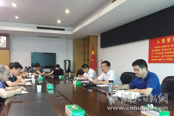 咸寧市委書記丁小強(qiáng)(右二)、咸寧市紀(jì)委書記程良勝(右一)、咸寧市委秘書長(zhǎng)、市主體辦主任張方勝(右三)集體約談該市3家2016年黨風(fēng)廉政建設(shè)不合格單位黨委書記。記者 江萌 攝