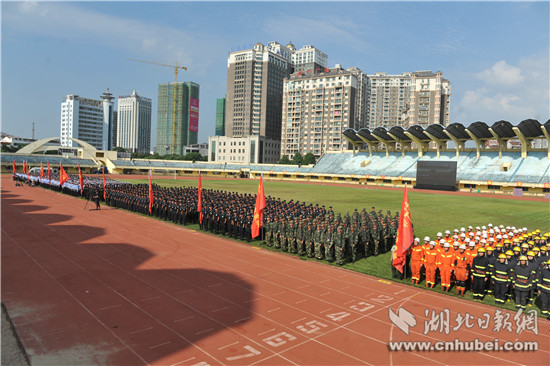 在警務(wù)技能演練之后,武警支隊(duì)、特警支隊(duì)和赤壁市公安局等單位60名民警,進(jìn)行了反暴恐合成作戰(zhàn)演練:公交車上制服歹徒、排爆員移除可疑爆炸物、狙擊手制服恐怖分子、談判專家現(xiàn)場(chǎng)喊話確保人質(zhì)安全……短短10多分鐘,各警種精誠(chéng)合作,成功處置一起暴恐事件。隨后,民警和消防官兵又先后進(jìn)行了重大交通火災(zāi)事故救援處置、突發(fā)事件應(yīng)急處置綜合演練。