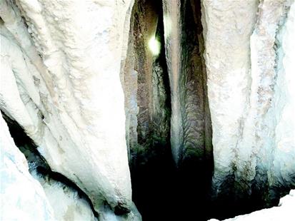 其中一個溶洞位于界水嶺村四組,小地名叫獅子磅,因山包上一塊巨石酷似仰天長嘯的獅子而得名,洞口就在新修的路邊。楚天都市報記者看到,挖開的洞口直徑約60厘米,里面深不見底,記者試著丟了塊石頭,只聽見一連串石頭撞擊洞壁的聲音。村民找來強光電筒,依然無法探到底。記者看到,洞壁上盡是石鐘乳,向洞底延伸不見終端,洞壁上有幾處石鐘乳呈人形。