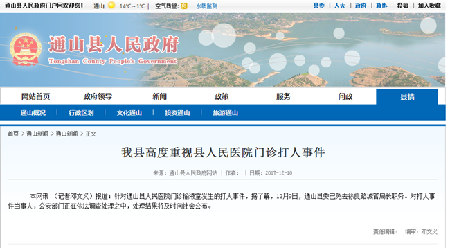 據(jù)通山縣委宣傳部通報(bào):2017年12月8日中午,通山縣人民醫(yī)院門診輸液室發(fā)生打人事件,通山縣公安局及時(shí)出警調(diào)查取證。事件發(fā)生后,通山縣委、縣政府高度重視,組建專班進(jìn)行處置,召集縣政府應(yīng)急辦、公安局、衛(wèi)計(jì)局、縣人民醫(yī)院等部門負(fù)責(zé)人會(huì)議:由縣人民醫(yī)院院長(zhǎng)成忠了負(fù)責(zé)組建醫(yī)療專班,做好治療護(hù)理工作;由縣人民政府副縣長(zhǎng)金大德負(fù)責(zé)組建公安調(diào)查專班,確保處置及時(shí)快速、公平公正。該事件正在調(diào)查處置中,處置結(jié)果將及時(shí)向社會(huì)公布。