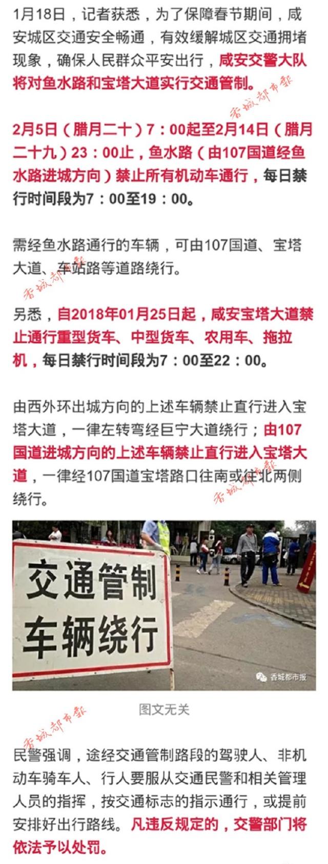 18日悉,為保障春節(jié)期間,咸安城區(qū)交通安全暢通,咸安交警大隊(duì)將對(duì)魚水路和寶塔大道實(shí)行交通管制。途經(jīng)交通管制路段的駕駛?cè)?、行人要服從交通民警和相關(guān)管理人員的指揮,按交通標(biāo)志的指示通行。凡違反規(guī)定的,將依法處罰。具體路段