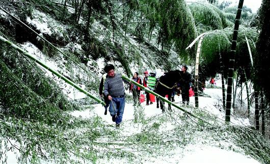 中午12時30分許,救援隊一行30余人出發(fā)。上山的路雖然是公路,但積雪很厚,最深處10余厘米,加上結冰,可謂步步艱難。一路上,被大雪壓斷的楠竹不時阻斷道路,救援隊專門請來三名村民,提前砍竹清障。大家跟著馬幫師傅,小心翼翼通過危險路段。