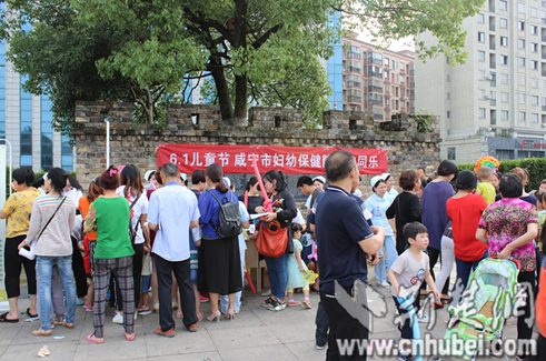 咸寧市婦幼保健院兒科醫(yī)護(hù)人員在咸寧市十六潭公園廣場(chǎng)上為孩子們義務(wù)體格檢查