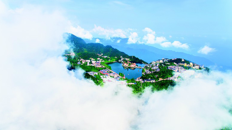 8月4日,空中鳥瞰通山縣九宮山國(guó)家級(jí)風(fēng)景名勝區(qū),山頂?shù)脑浦泻ㄈ灰恍隆?/p>