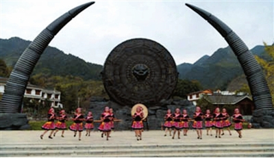 大坪鄉(xiāng)內(nèi)沖村村民在遙望千年廣場表演拍打舞