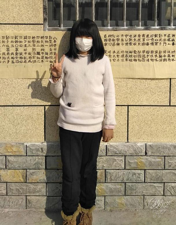這幅《新型肺炎防控拍手歌》出自神山鎮(zhèn)蓮塘村年僅10歲的漆家萱小朋友之手。漆家萱有著一頭烏黑亮麗的秀發(fā),雖然戴著口罩但仍遮掩不住她的活潑開朗,身后這副長長的毛筆字疫情防護(hù)宣傳墻貼,是她自發(fā)完成的。