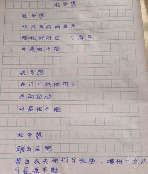 夫妻倆的大寶二寶,被托付給爺爺奶奶照料。多日不見父母,他偷偷寫下一首詩《我多想》:“我多想,讓爸爸媽媽回來,陪我好好過一個新年,可是我不能……我多想,跑去醫(yī)院,幫白衣天使分擔一些,哪怕一點點,可是我不能……”字里行間,流溢出滿滿的思念。