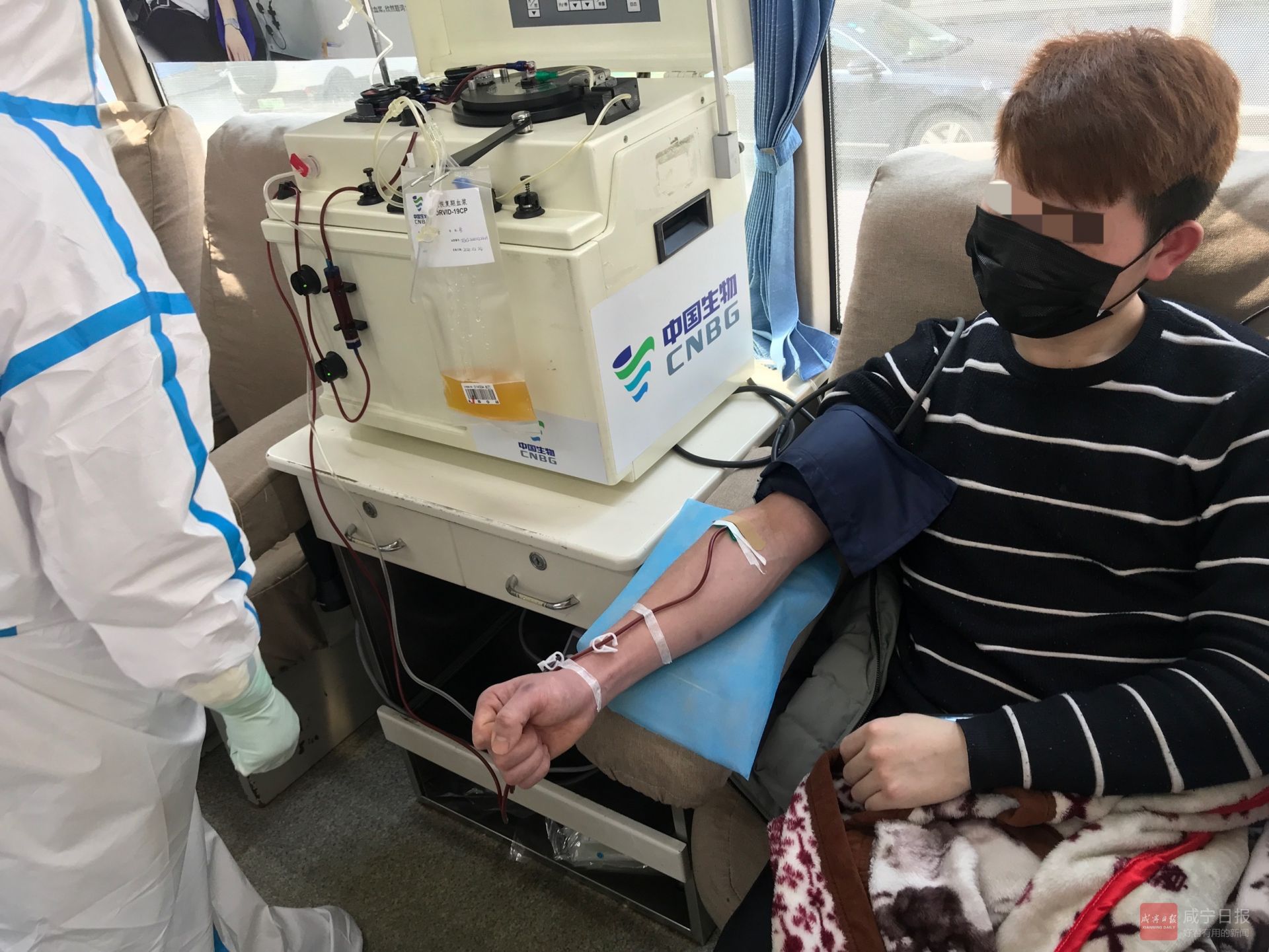 當(dāng)天,治愈患者程某在經(jīng)過CT、核酸檢測(cè)、體檢征詢等一系列操作后,在咸寧市中心血站流動(dòng)采血車上接受了血漿采集,共400毫升。