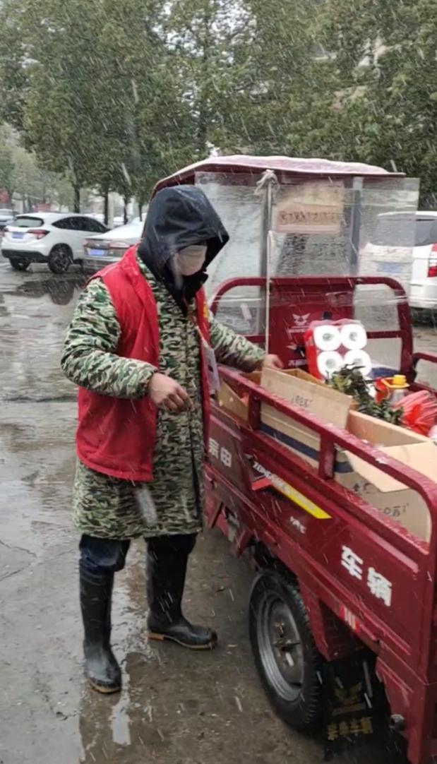 何正武負(fù)責(zé)整個(gè)小區(qū)生活保障物資配送、廣播宣傳巡查、樓棟排查。15日,他為20多戶居民送來訂購的菜,風(fēng)雪中,他在門衛(wèi)足足等了兩個(gè)多小時(shí),最后只等來了三位居民前來拿走預(yù)訂的菜。盡管如此,他還是一如既往,做好物資配送等各項(xiàng)工作。