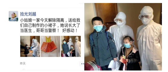 隔離解除,依依惜別,萌娃兄妹把精心制作的手工,送給日夜相伴的“拾光劉越”等醫(yī)護人員。“長大也要當醫(yī)生、當警察。”稚氣的話語,讓“拾光”感動。