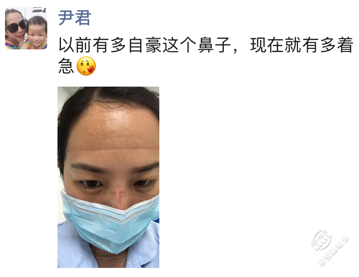 “以前有多自豪這個鼻子,現(xiàn)在就有多著急?!边B續(xù)高強度工作,長時間佩戴口罩,將護士尹君的鼻梁勒磨得傷痕累累。短暫的心疼與“著急”后,她又繼續(xù)奔忙在市人民醫(yī)院隔離病區(qū)。