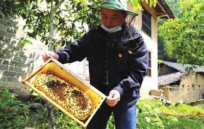 二組王必珍,今年70歲,是建檔立卡貧困戶。1990年右手截肢,靠養(yǎng)幾箱蜜蜂度生,并不斷投資蜂業(yè)。他介紹,養(yǎng)蜂是個(gè)好產(chǎn)業(yè),他雖然手不方便,但活兒不累。他與記者算起賬。他說(shuō),一個(gè)蜂箱有5個(gè)框,一個(gè)框搖糖1到1.5斤。一個(gè)箱一年搖糖3到4次,每斤糖按50元計(jì)算,20個(gè)箱就是2萬(wàn)多元。深山無(wú)污染,一年四季有蜜源,九月黃、牛藤、勾藤、芙蓉花等,就是冬天,也有柃木開(kāi)花。