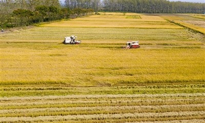 13日,嘉魚簰洲灣田野一片金黃,40000多畝晚稻田里,幾十臺(tái)收割機(jī)、運(yùn)輸車一片忙碌。