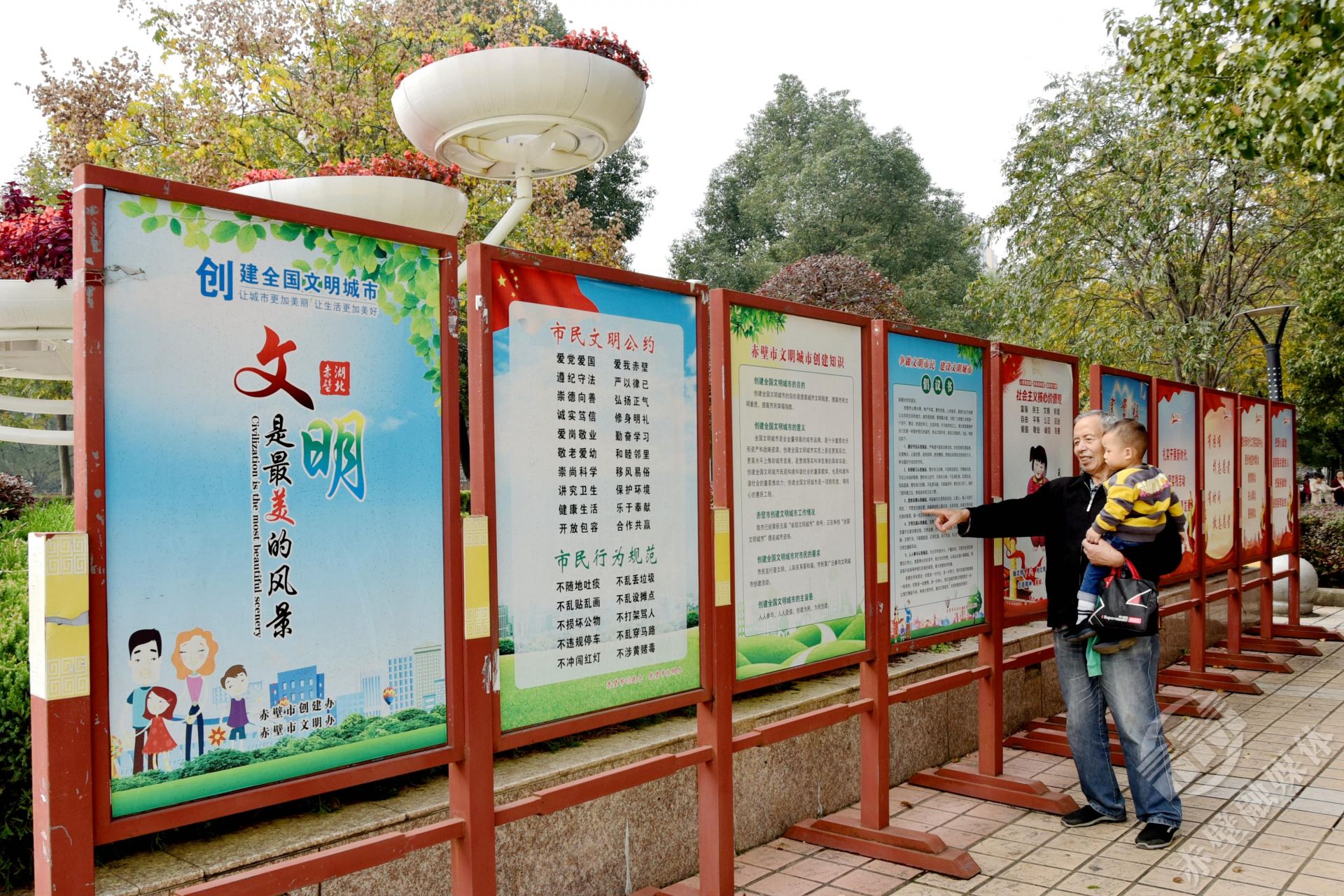 “今天帶孫子出來轉(zhuǎn)轉(zhuǎn),抬眼就看到這個,正好教孫子認(rèn)認(rèn)字?!?0月29日,溜彎在人民廣場的羅爺爺指著文明創(chuàng)建宣傳展板開心的對記者說。