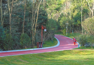 除了騎行、慢跑道外,還依山建有數(shù)條木棧道,與前三期的道路連通,形成立體游憩交通網(wǎng)絡(luò)。玉泉街的兩邊設(shè)有生態(tài)停車場,已經(jīng)施劃好停車位。
