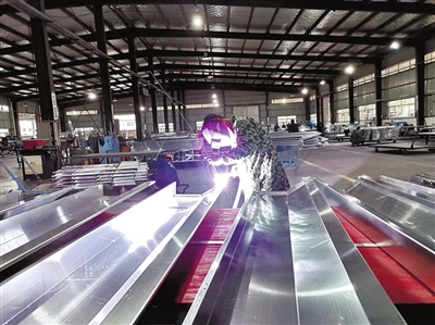 在中港金屬制造有限公司車間外,一輛加長(zhǎng)貨車正在裝運(yùn)送往武漢的成品。車間里,焊花飛濺,工人們正在熟練地完成原材料開(kāi)料、折彎、焊接、拋光等工序。