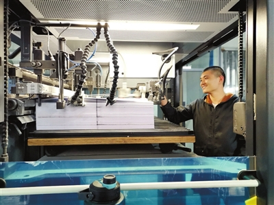 3月3日,記者在山河文化發(fā)展有限公司看到,車間里機(jī)聲隆隆。在一個(gè)大型流水機(jī)器旁,一名員工專注地放紙,隨后機(jī)械打印、切割、檢驗(yàn)、裝訂成書(shū)……人機(jī)配合十分默契。