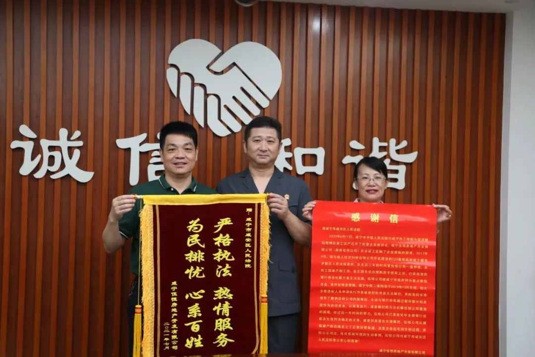 “感謝咸安區(qū)法院,讓我們公司從瀕臨破產(chǎn)的邊緣走回正常經(jīng)營的軌道,幫助我們起死回生......”7月16日下午,咸寧伍恒房地產(chǎn)開發(fā)有限公司(以下簡稱伍恒公司)負(fù)責(zé)人將一面寫有“嚴(yán)格執(zhí)法,熱情服務(wù);為民排憂,心系百姓”的錦旗和一封感謝信送至咸安區(qū)法院,感謝區(qū)法院執(zhí)行局善意文明執(zhí)行,幫助企業(yè)渡過難關(guān)。