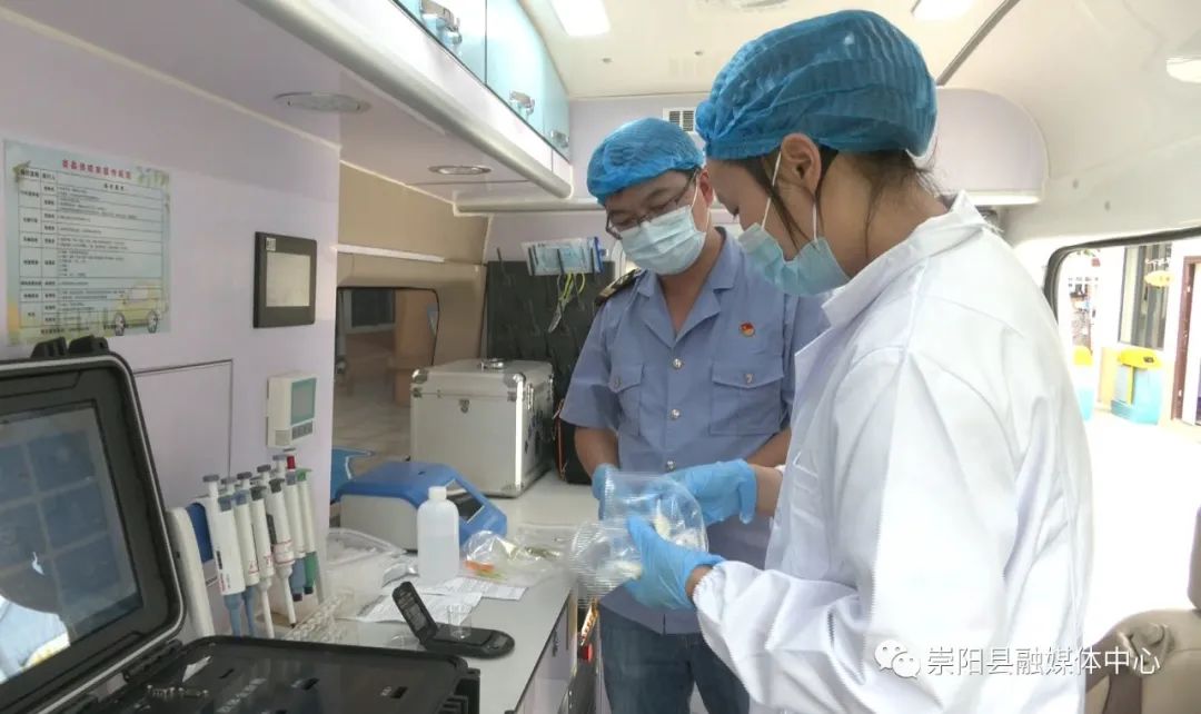 在崇陽縣第二幼兒園,檢測人員正在為采樣做準(zhǔn)備,在將專業(yè)儀器、設(shè)備調(diào)試好后,對校園食堂里已經(jīng)過消毒的餐具進(jìn)行拭子采樣,隨后將采樣的拭子放入檢測儀器中。