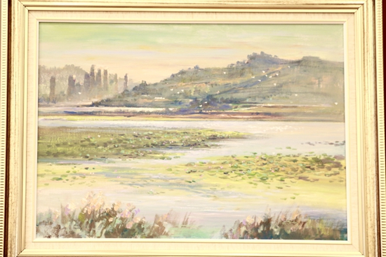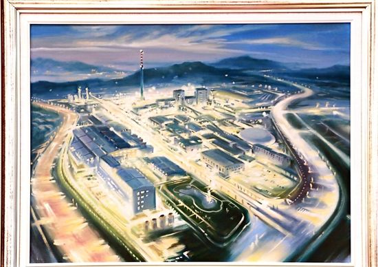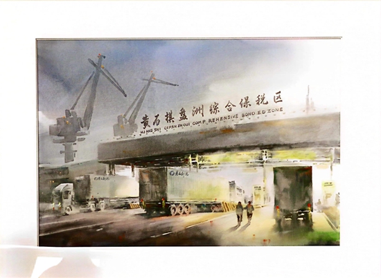 第一幅畫,展示的是數(shù)只船舶在新港碼頭裝卸貨物的繁華景象。第二幅畫,卡車進(jìn)入棋盤洲綜合保稅區(qū)外卡口的實景記錄。第三幅畫,描繪的是園區(qū)夜間工廠燈火通明、24小時生產(chǎn)不停的場景。第四幅畫,以綠色為底色,展示的是人與自然和諧共生的美景。第五幅畫,描繪的是棠梨湖商業(yè)街的街景。