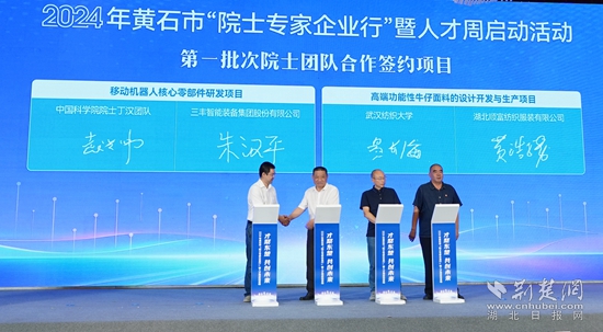 現(xiàn)場還舉行了項目簽約活動,簽約移動機器人核心零部件研發(fā)項目、高端功能性牛仔面料的設(shè)計開發(fā)與生產(chǎn)項目等2個院士專家合作項目、球墨鑄鐵管壁測量項目等10個人才合作項目以及4個人才服務(wù)合作項目,并為鄂東技師學(xué)院國家級高技能人才培訓(xùn)基地授牌。