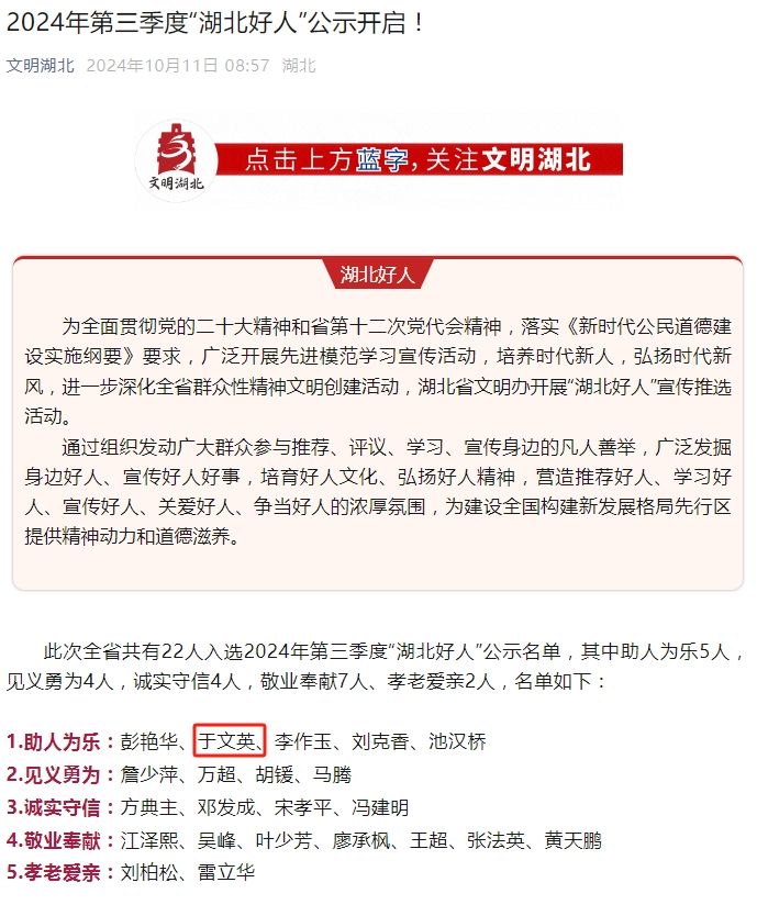 荊楚網(wǎng)(湖北日報(bào)網(wǎng))訊(記者呂鑒蕾 通訊員黃旺宣、華文莉)10月11日,2024年第三季度“湖北好人”公示開啟,全省共有22人入選公示名單。其中,“鑰匙姑娘”于文英榜上有名。