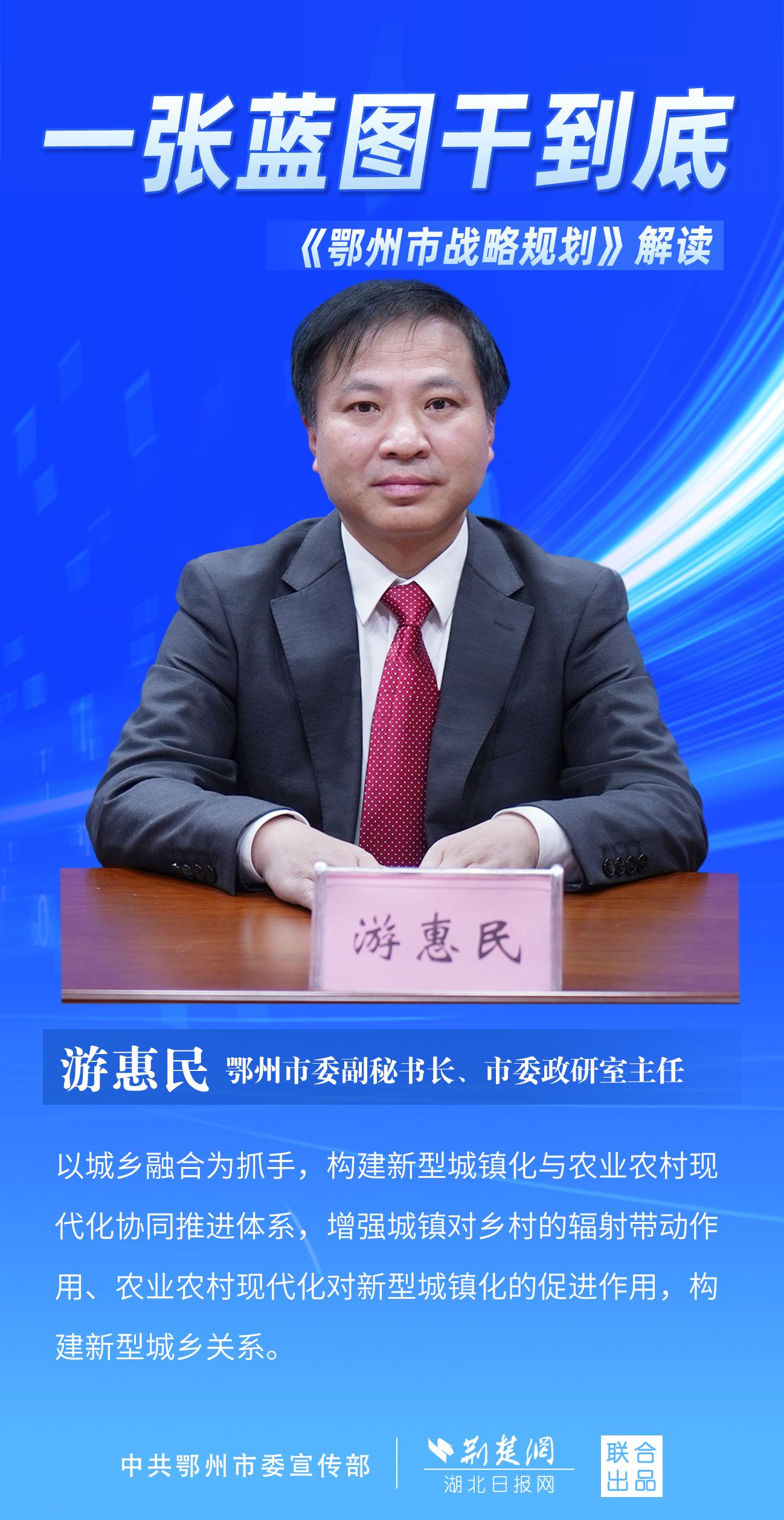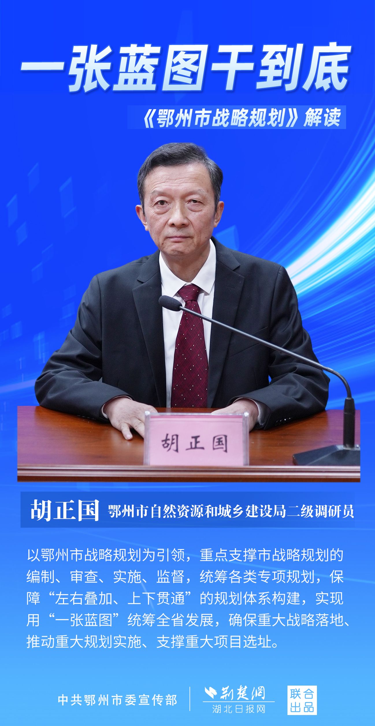 荊楚網(wǎng)(湖北日?qǐng)?bào)網(wǎng))訊(記者 劉璐、金康 通訊員 胡彥)11月7日上午,鄂州市召開新聞發(fā)布會(huì),宣布《鄂州市戰(zhàn)略規(guī)劃》即將印發(fā)實(shí)施。市委副秘書長、市委政研室主任游惠民透露,從機(jī)制優(yōu)化、指標(biāo)考核、項(xiàng)目實(shí)施等方面確保規(guī)劃制度有依據(jù)、成效可考核、實(shí)施有抓手。具體如何落實(shí)落地?讓我們用一組海報(bào)解讀《鄂州市戰(zhàn)略規(guī)劃》。