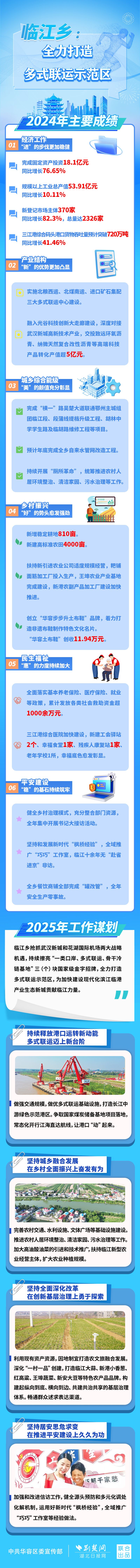 2024年,臨江鄉(xiāng)圍繞打造多式聯(lián)運示范區(qū)發(fā)展目標,全年各項目標任務(wù)取得新成效。2025年,臨江鄉(xiāng)如何全力打造多式聯(lián)運示范區(qū)?荊楚網(wǎng)(湖北日報網(wǎng))帶您一圖速覽。
